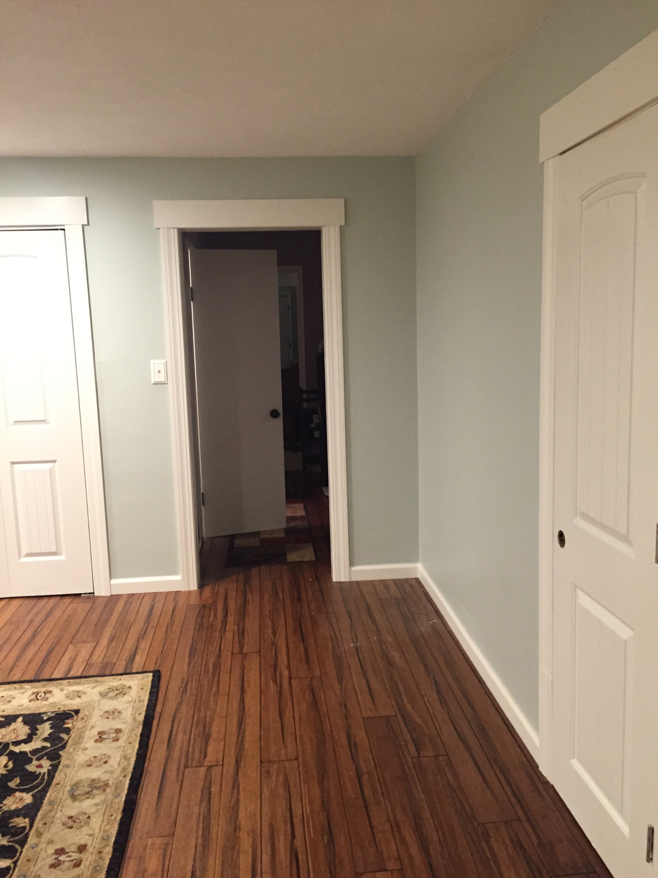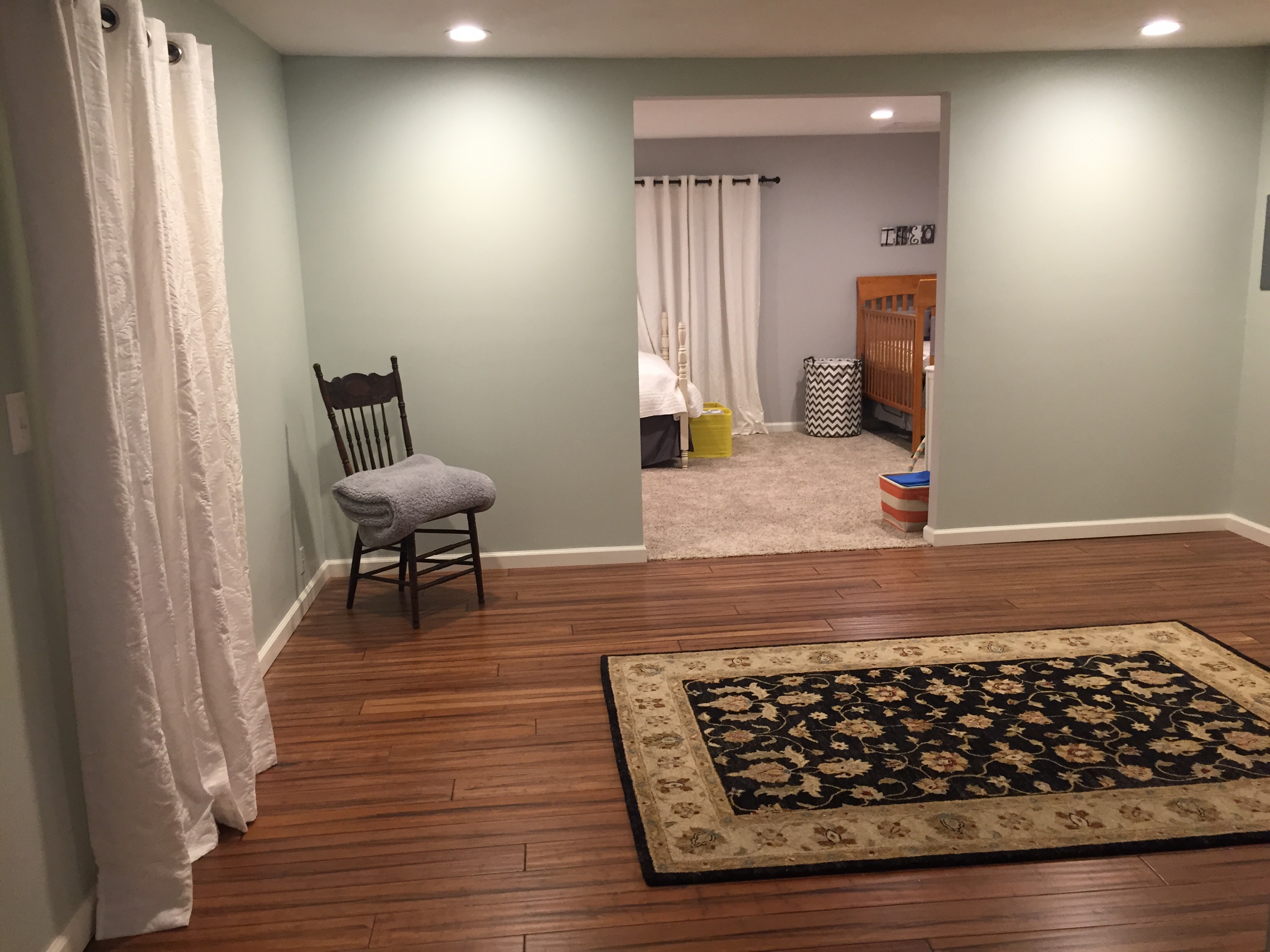 We have turned the old “bunk room” into two seperate rooms that will eventually have sliding barn doors to section off Theo’s room from the from living room/play room. New bamboo floors in front, carpet in back optimal for baby rolling and exploring. New doors on all closets, new trim, new paint, new windows… All things new.