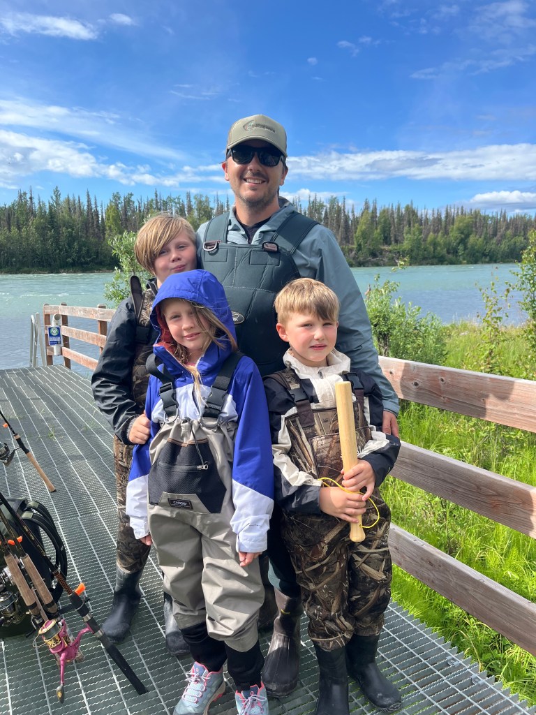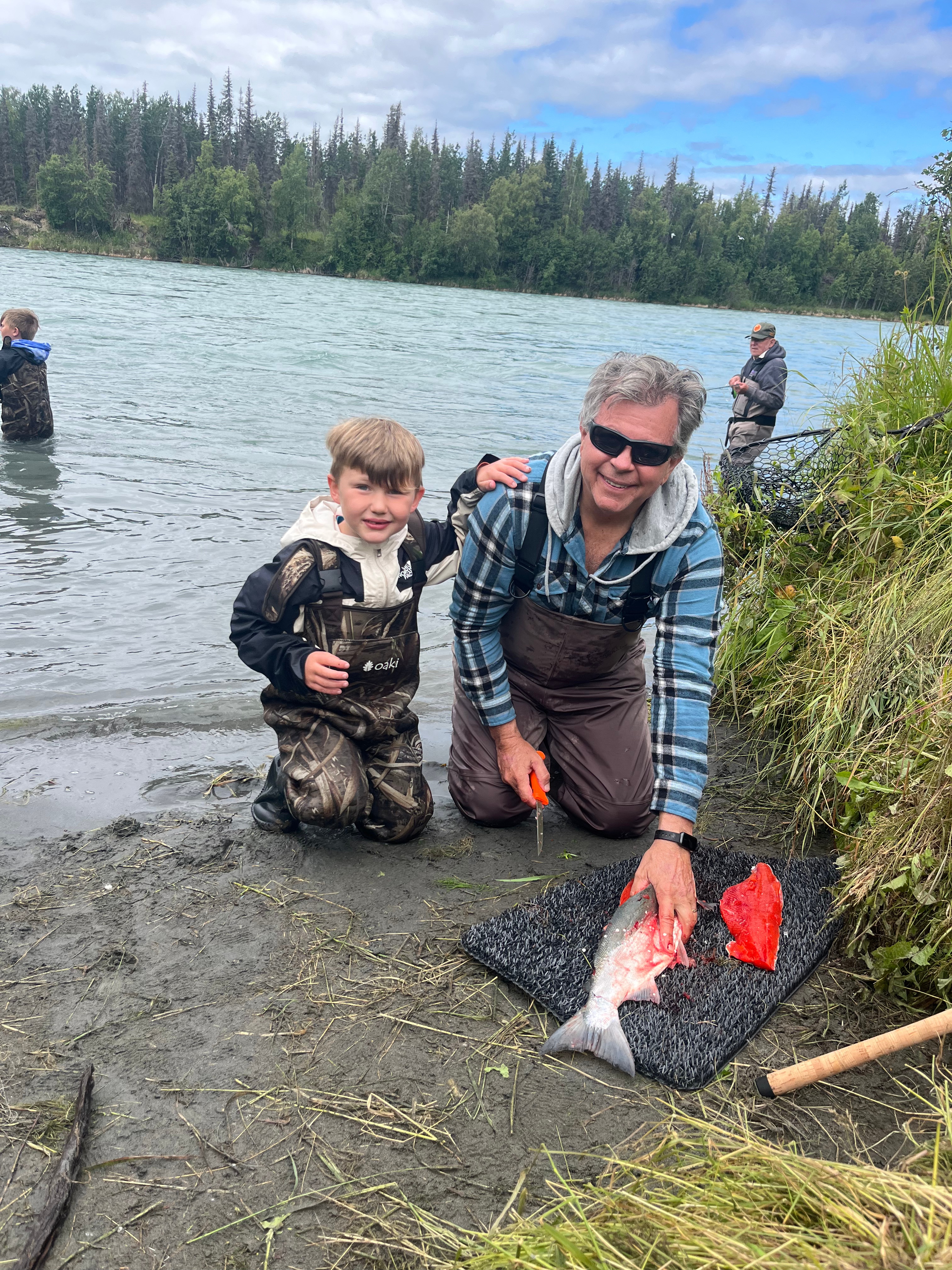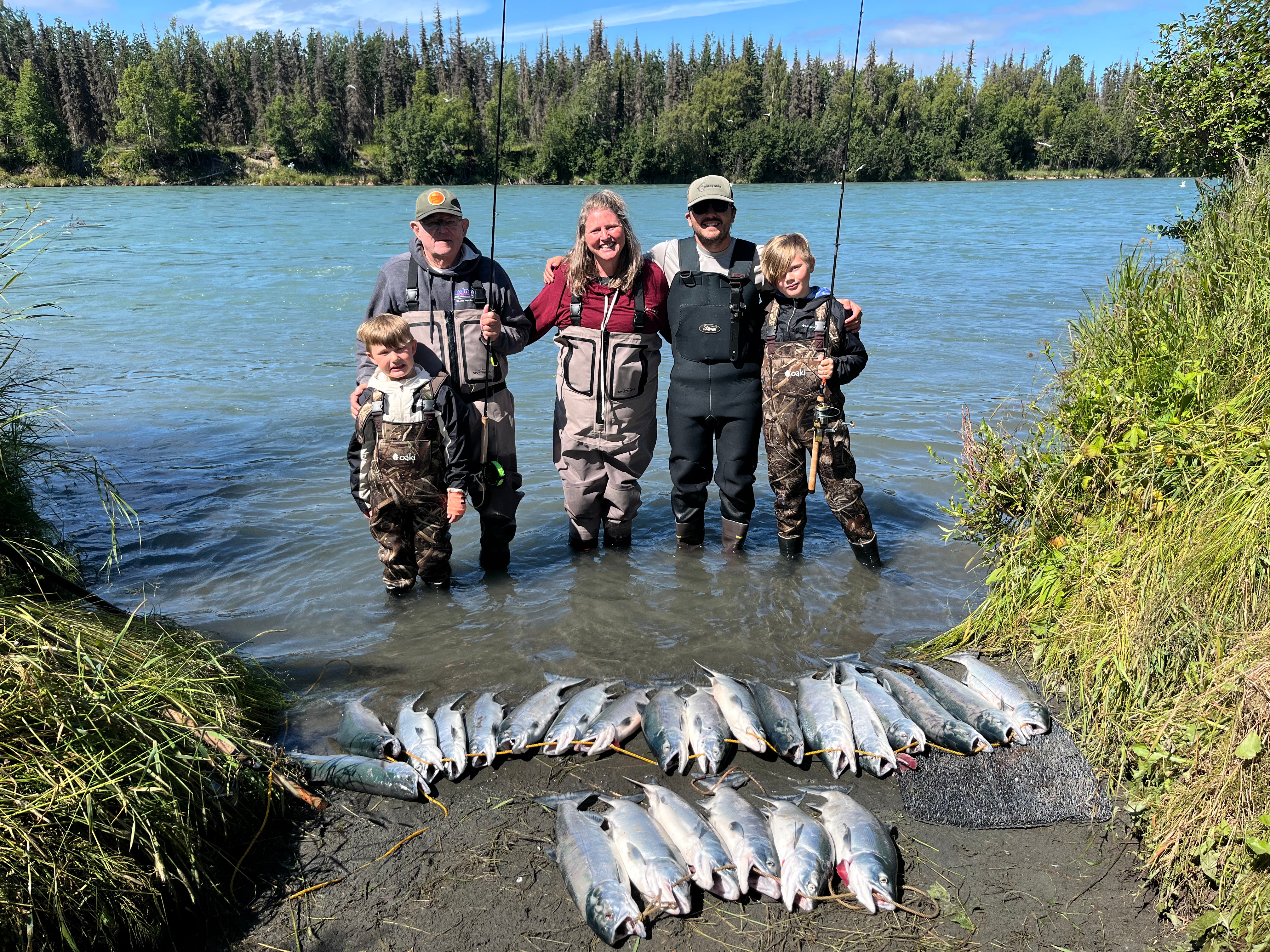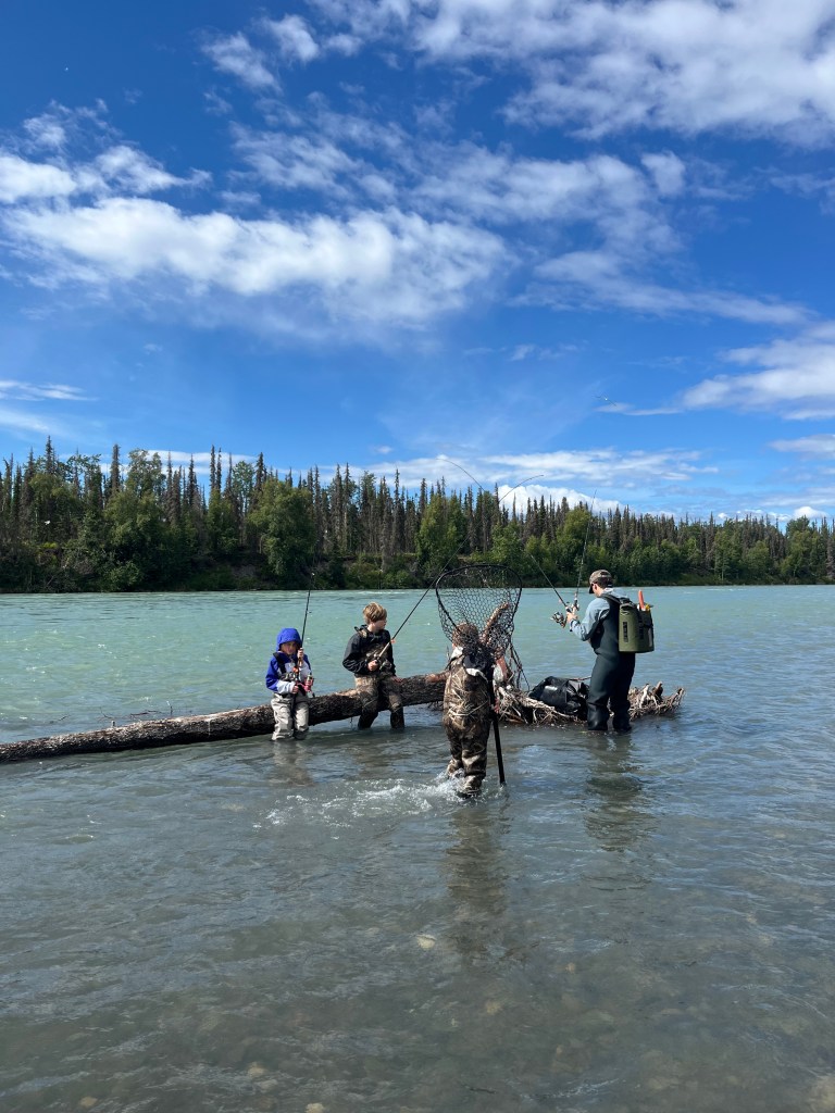 By breakfast, they were done with halibut and had plenty of time for another adventure: salmon. Salmon is the main fish we are here for. Our primary spot for salmon fishing will be the Kenai River—but this was like a mini preview. Thad and Dawson took them upriver to fish for salmon.